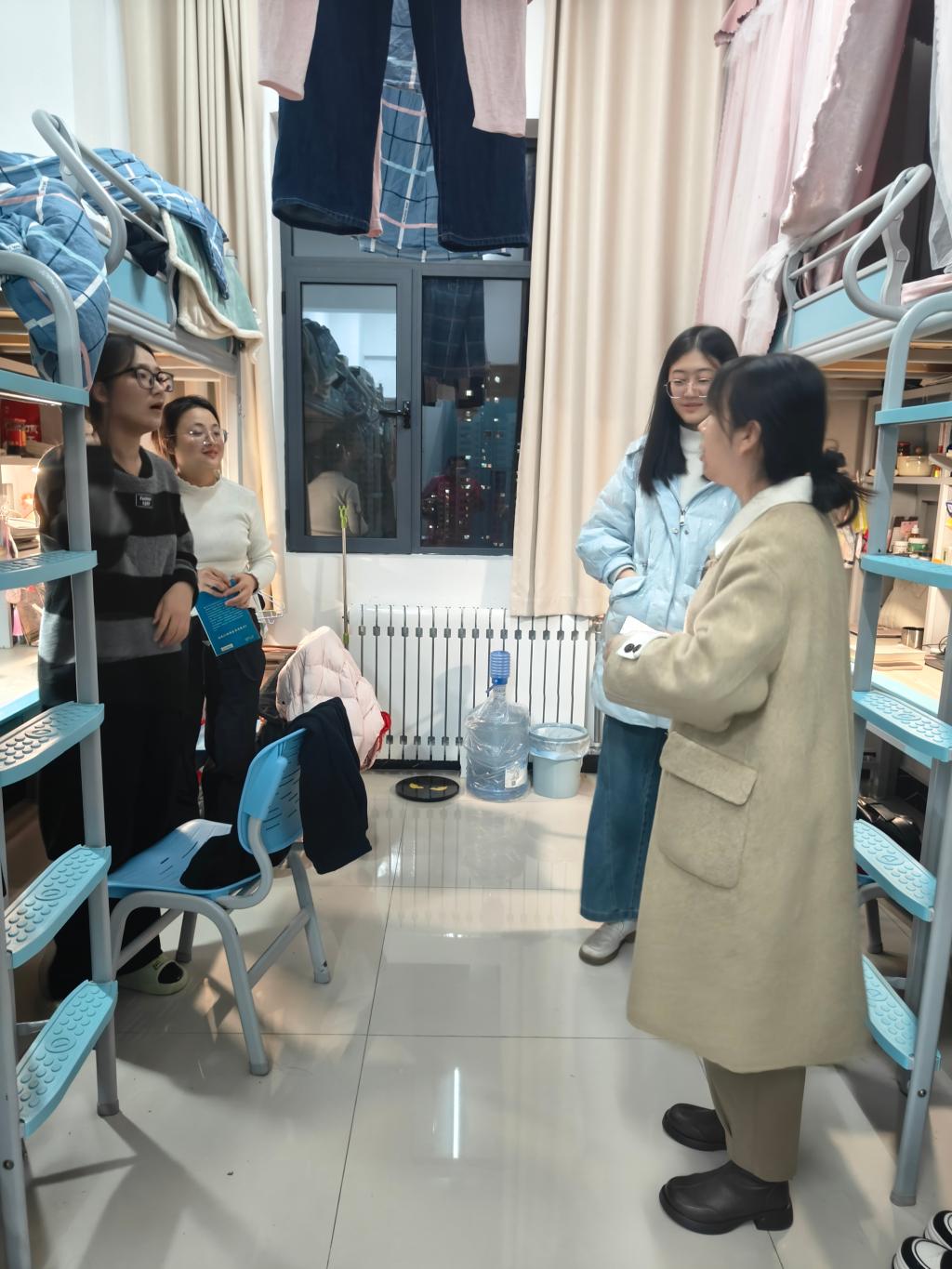 为圆满完成2024年文明宿舍创建工作,深入了解学生生活和学习情况,Beat365官方网站学生工作小组走访学生宿舍开展慰问活动,完成文明宿舍创建的评比验收。