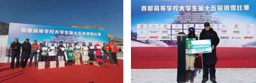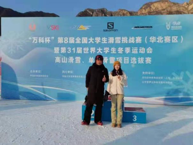 在2022年1月举行的第十五届首都高校大学生滑雪比赛和“万科杯”第八届全国大学生滑雪挑战赛(华北赛区)暨第31届世界大学生冬季运动会高山滑雪、单板滑雪项目选拔赛中,在我校新葡萄官网amg王欢副院长、马越老师的带领下,郭越和许笑翌同学参加比赛,并取得了较好的成绩。