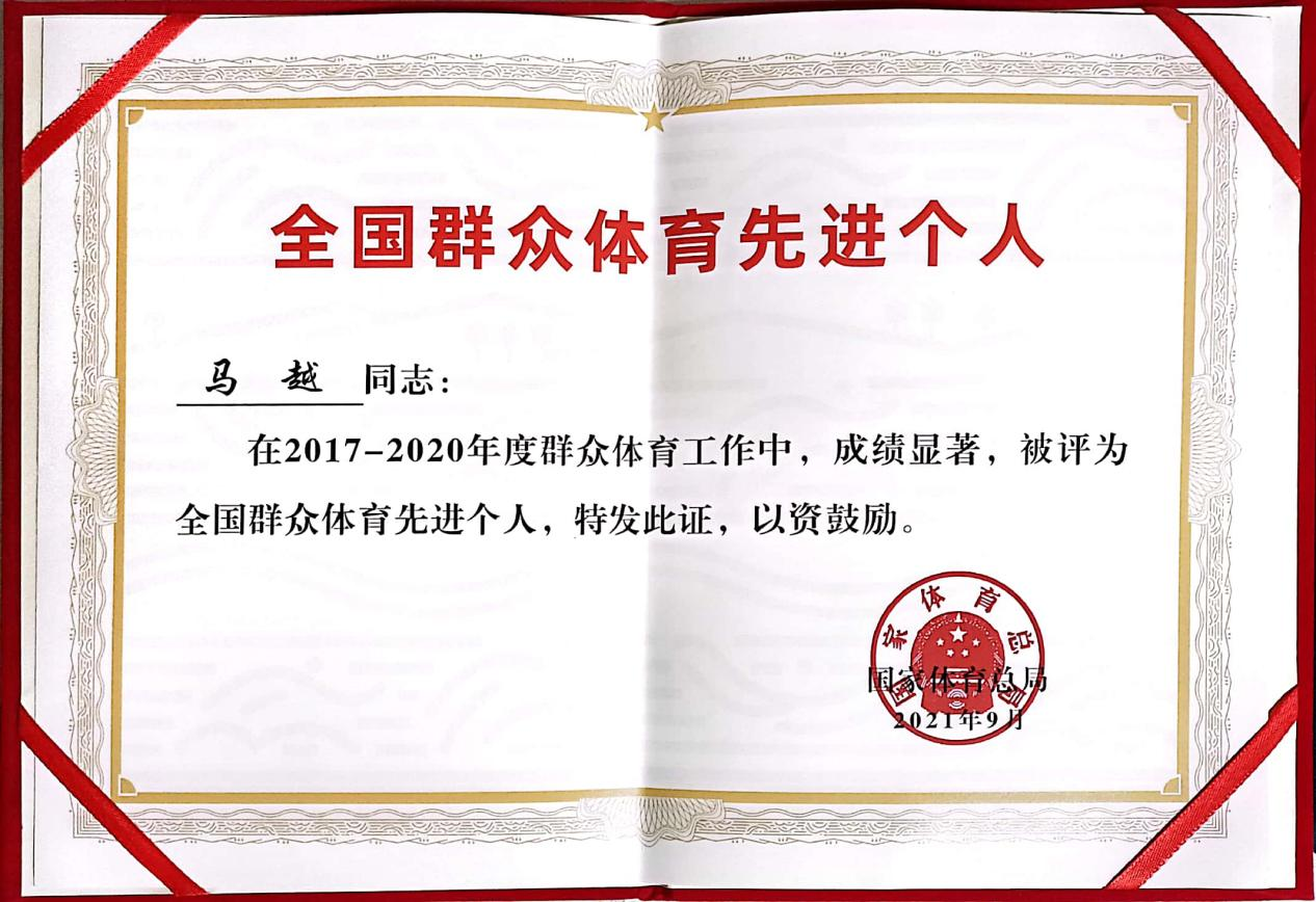 2021年9月,新葡萄官网amg副教授马越老师荣获“全国群众体育先进个人”称号表彰。此称号是全国群众体育领域内唯一经中央批准的,是全国群众体育工作的最高奖项,每四年举办一次,是体育系统最高规格表彰,历史传承久、导向意义大,是全国体育领域的大事。