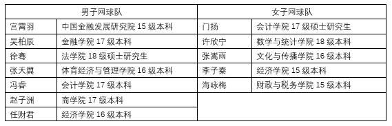 中央财经大学网球队组建于2018年10月,目前共有11名队员。队员均有多年的网球基础,平均水平3.5以上,其中不乏一批网球国家二级运动员。虽然成立时间很短,但队员们刻苦训练,克服了诸多困难,取得了长足进步。在此前的首都高等学校大学生网球联赛春季团体赛、北京大学网球公开赛、中国政法大学网球公开赛等比赛中都取得了十分亮眼的成绩。基础扎实的功底、坚持刻苦的训练、大小比赛的磨砺使中财网球队第一次参加大网赛就“一鸣惊人”。