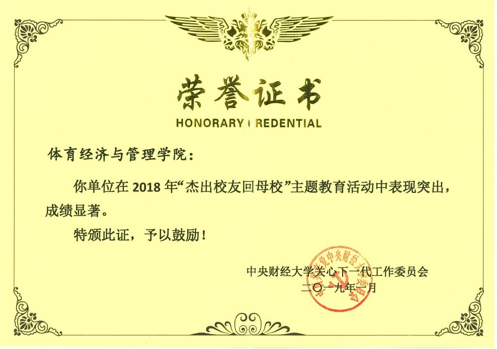 在1月10日召开的中央财经大学关工委2018年总结表彰会暨2019年工作布置会上,新葡萄官网二级关工委在2018年“杰出校友回母校”主题教育活动中表现突出受到了表彰,荣获了三等奖。关工委全称为关心下一代工作委员会,新葡萄官网二级关工委于2018年12月成立。成立时间虽短,但得到了学校关工委、广大校友和学院教职员工的大力支持和鼓励,未来将继续努力开展更多活动。