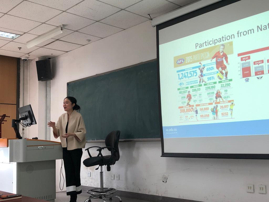 11月12日星期一,应新葡萄官网王裕雄老师邀请,来新葡萄官网参加学术研讨会的澳大利亚维多利亚大学商学院Catherine LOU博士为2016-1班《体育组织管理》课程授课,向大家介绍澳大利亚职业体育组织管理。LOU博士对澳大利亚体育产业价值链有深入研究,与澳式足球联盟AFL以及Football Federation Victoria有很好的合作关系,并作为专家多次参与上述运动联盟的活动和会议。