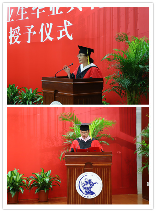 在庄严雄壮的国歌声中典礼正式拉开序幕。首先,林琼书记致辞并介绍了出席典礼的各位学院领导、老师和嘉宾。由王裕雄副院长宣读了《新葡萄官网amg2018届毕业生授予硕士、学士学位的决定》。随后,林书记宣读了《2018届基层工作毕业生表彰名单》和《2018届优秀毕业生名单》。林书记为3名基层工作毕业生颁发奖品和证书,王裕雄和王欢两位副院长共同为7名校级优秀毕业生颁发奖品和证书。最后,张本家副院长为2名市级优秀本科毕业生颁发奖品和证书。