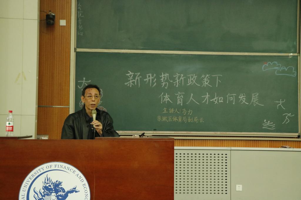 当日下午15:30,讲座开始。马局长从四个方面——体育产业人才的概念与分类,体育产业人才的缺口,国务院46号文件关于体育产业人才及职业的描述以及给青年大学生的几点建议,深入浅出的为同学们指出了体育产业人才的缺口以及体育产业人才应当具备的素质。