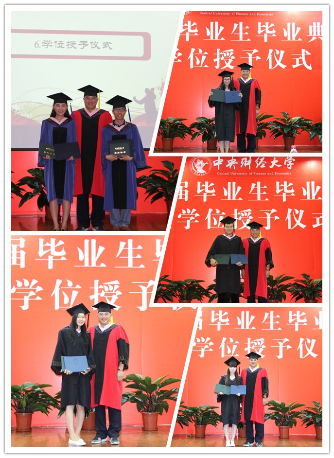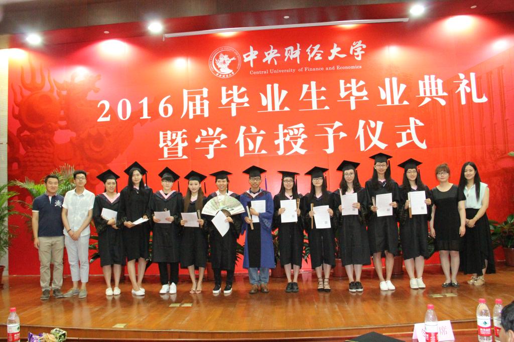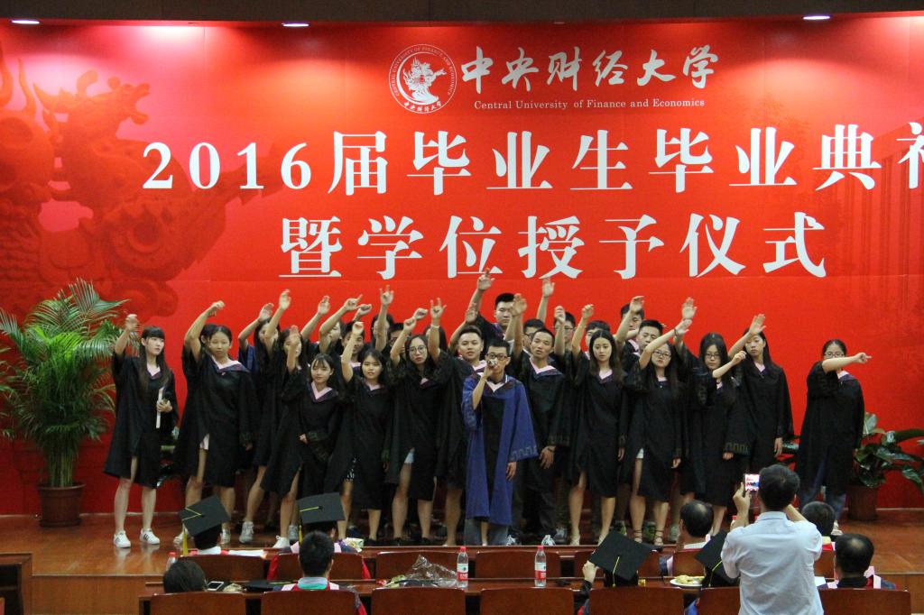 之后,举行校友授予仪式。从学校毕业意味着身份由“学生”向“校友”的转变,学院在校友总会之下成立有体经校友分会,学院校友分会秘书长李秋月老师向2016届毕业生代表赠予了校友徽章和校友通讯录,正式接收2016届毕业生为中财体经校友分会的成员。