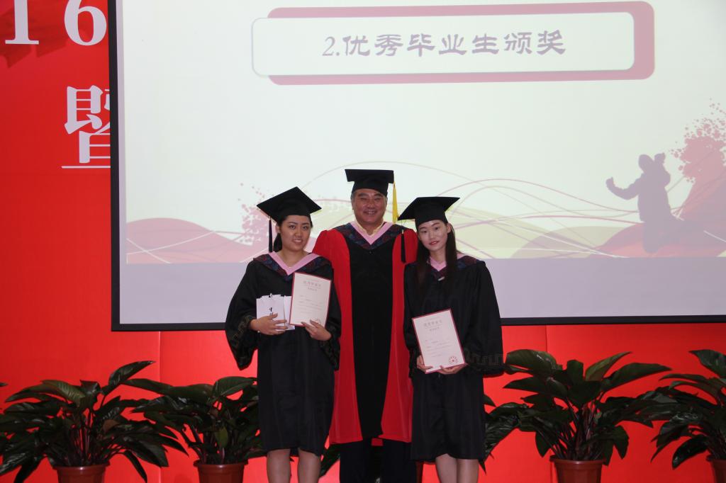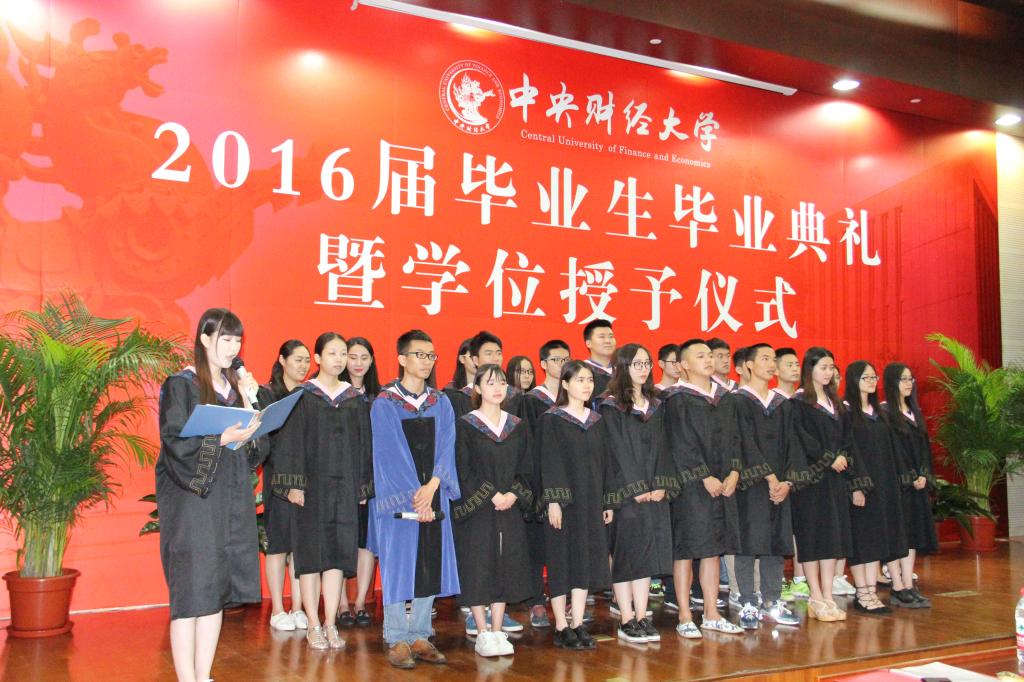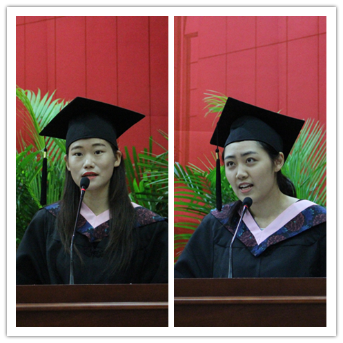 北京市级优秀毕业生荣亚菲、孙悦代表2016届毕业生上台发言。在发言中,荣亚菲追忆了四年学习生活的过往,感恩母校和学院,感恩老师和同学,给予她深刻而美好的回忆。孙悦在发言中表达了自己在过去的收获及未来对于梦想的追寻,和对毕业生及学院的美好祝福。