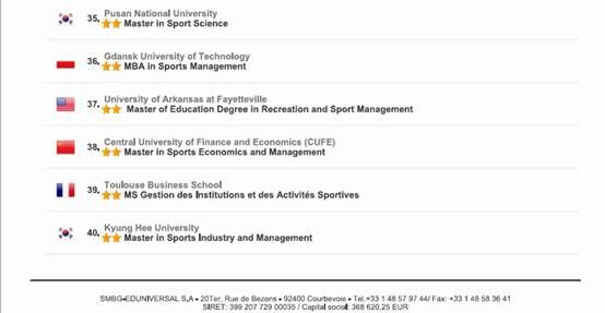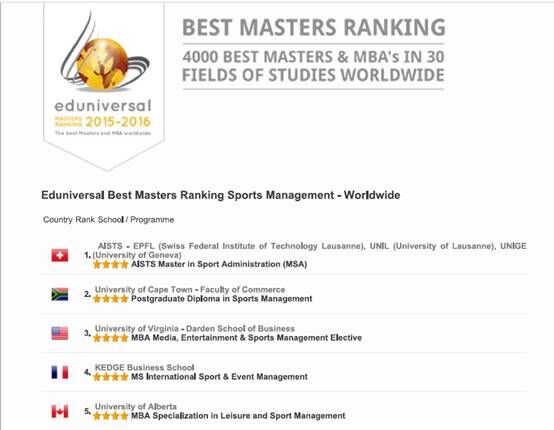 根据全球权威独立评估机构Best-Master在最新年度(2015-2016)的《Best-Master世界硕士项目专业排名》,我校体育经济与管理专业的研究生(硕士)专业跻身世界三十八强,相较去年上升了7名。