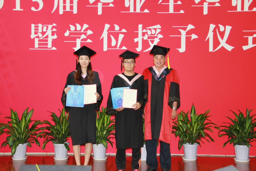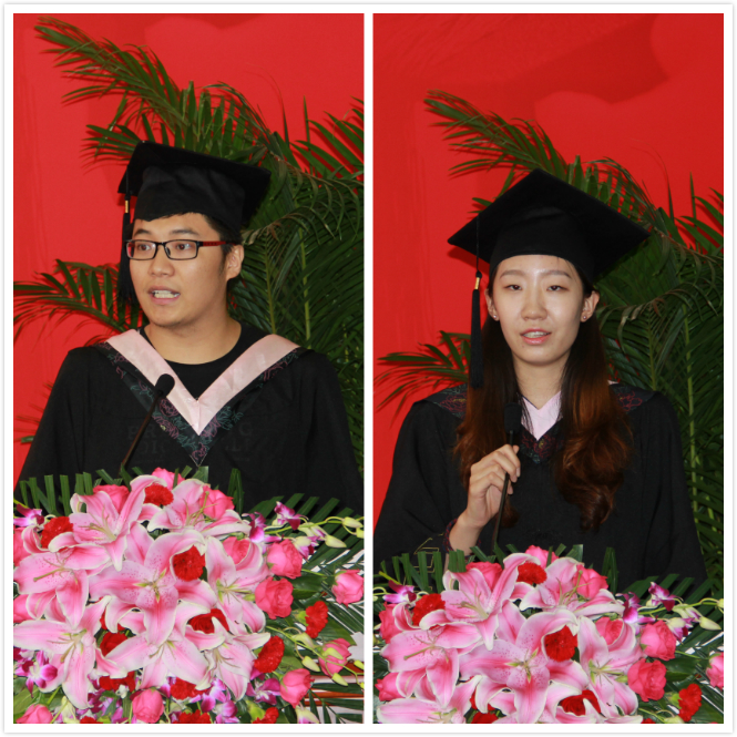 优秀毕业学生代表田栋、胡娅囡代表2015届毕业生上台发言。在田栋的发言中,他追忆了自己大学中最普通的每一天,感念了师恩、友情,浓浓的离别不舍之情溢于言表,台上台下的师生几度哽咽。胡娅囡在自己的发言中感谢母校,感念师恩,表达了对未来梦想追求的坚定信念以及对毕业生们美好的祝福。