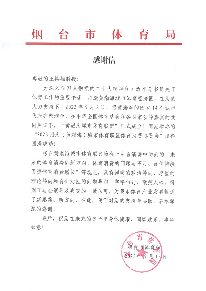 9月15日,烟台市体育局向新葡萄官网王裕雄教授发来感谢信,感谢王裕雄教授在“黄渤海城市体育联盟峰会”上为烟台市体育产业发展输送了新思路、新方向。
