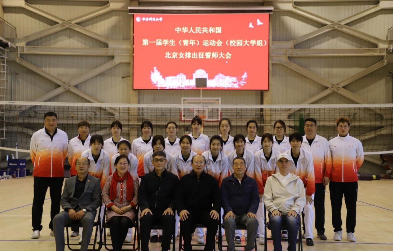 2023年10月20日下午,中华人民共和国第一届学生(青年)运动会(校园大学组)(以下简称“学青会”)北京女排代表队出征誓师大会在中央财经大学沙河校区体育馆二层会议室召开。北京市大学生体育协会秘书长张威,副秘书长刘国庆、张鹏增,竞赛部主任刘铮,排球分会主席崔迎春,新葡萄官网amg党委书记宋立岩、女排主教练于雅光、杨昊出席了本次会议,全体女排队员参加会议。会议由北京女排领队、新葡萄官网amg院长张本家主持。