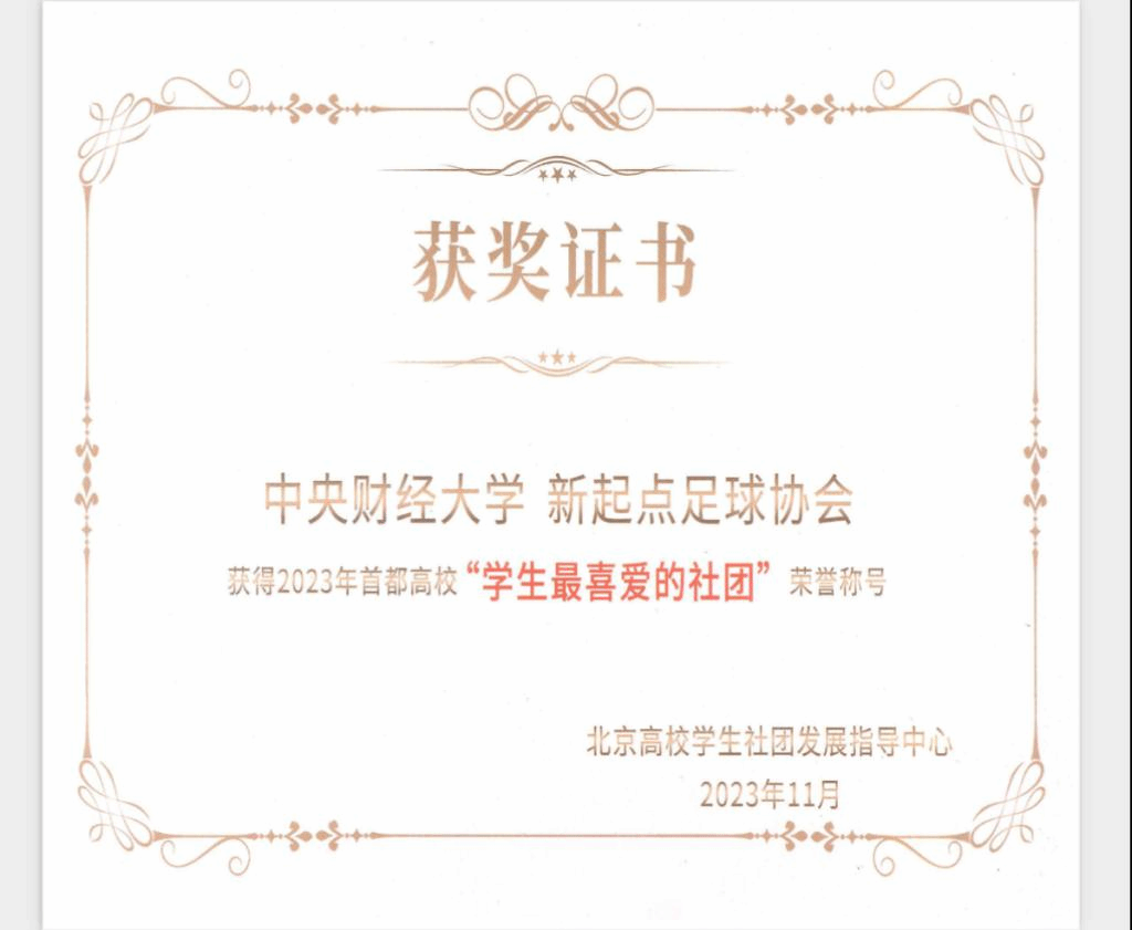 日前,由新葡萄官网王哲和李坤两位老师指导的学校综合性体育类社团----新起点足球协会,荣获2023年首都高校“学生最喜爱的社团“”荣誉称号。