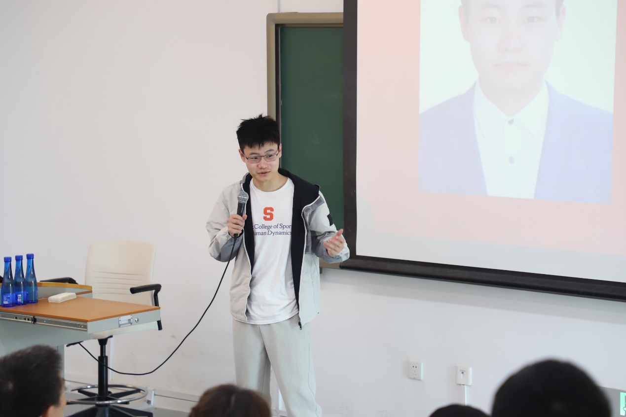 郭恺阳同学是雪城大学在读三年级学生,他向同学们分享了在雪城大学大卫·福尔克体育学院的求学生活和见闻,并就提问向同学们介绍了雪城大学体育管理专业的课程设置、国外体育管理的发展方向、国内外体育产业管理的不同等问题。