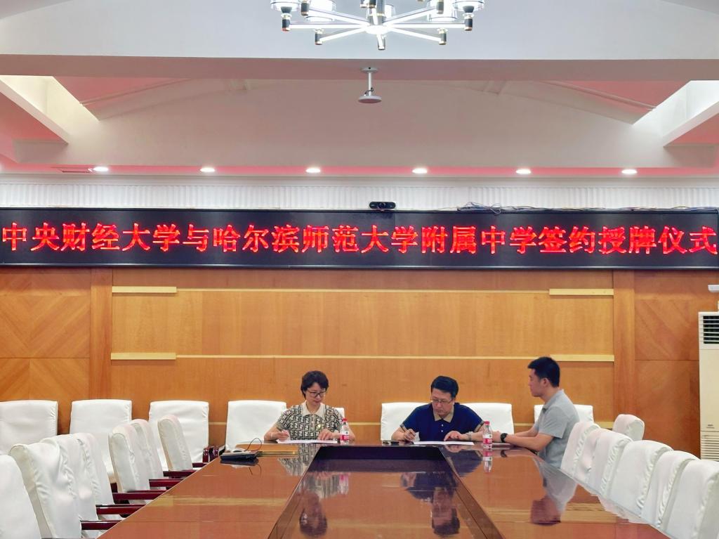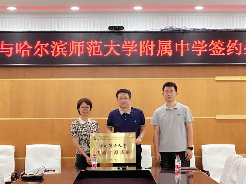 6月11日,招生宣传工作组前往哈尔滨师范大学附中,陈绮文老师代表学校与哈尔滨师范大学附属中学代表宫东亮副校长签署优质生源基地协议,并向哈尔滨师范大学附属中学授予“中央财经大学优质生源基地”牌匾,希望双方进一步加强合作,积极宣传中央财经大学,鼓励同学们踊跃报考中央财经大学。哈尔滨师范大学附属中学高二学年副主任王磊老师、学生处副主任冯立伟也参加了仪式。