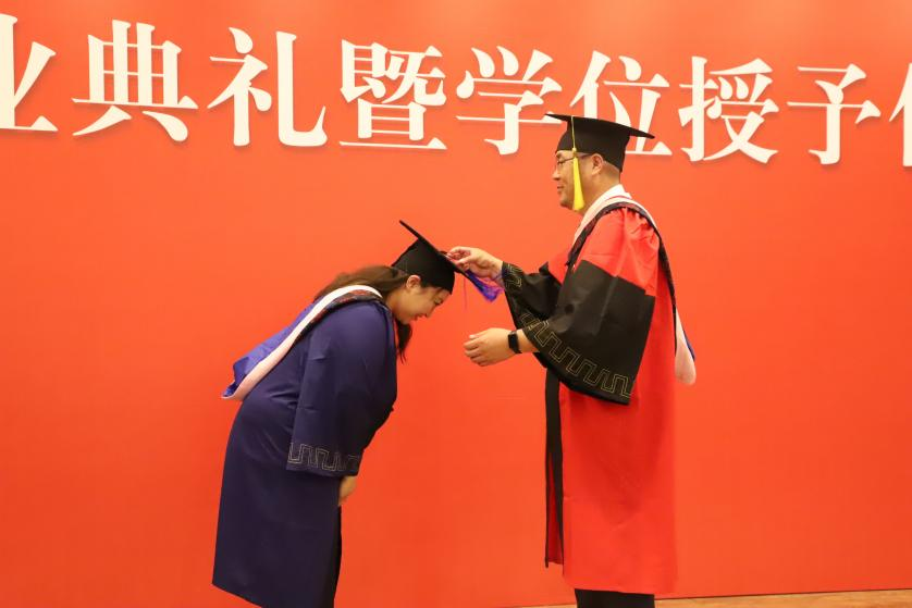 学位授予仪式的环节。张丛杉副院长宣读毕业生学位授予名单,张本家院长为毕业生们拨穗授予学位并颁发毕业证、学位证。