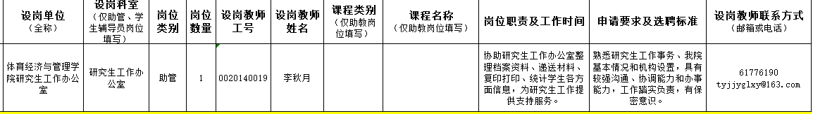 根据《中央财经大学研究生“三助一辅”工作管理办法》和《关于开展2022-2023学年第一学期“三助一辅”岗位设聘工作的通知》等相关文件要求,本学期学院设1个助管岗位,设岗信息要求见下表: