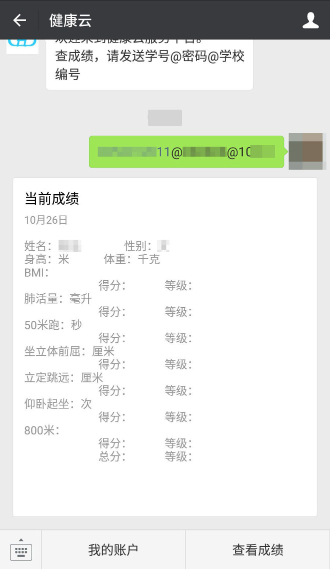 3、收到成绩消息即为绑定成功,绑定成功后单击“我的账户”,可以查看个人基本信息,单击“查看成绩”,可以随时查看成绩。