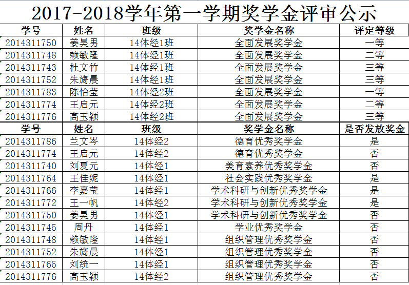 根据《关于做好2018届本科毕业生素质评价及奖学金评定工作的通知》(学字〔2018〕10号)的相关要求和评选条件,结合申请情况,学院学生工作委员会召开评审会,对所有申请2017-2018学年第一学期奖学金的2018届本科毕业生的进行评选,现将拟评定结果公示如下: