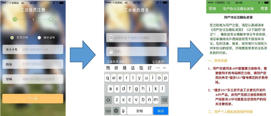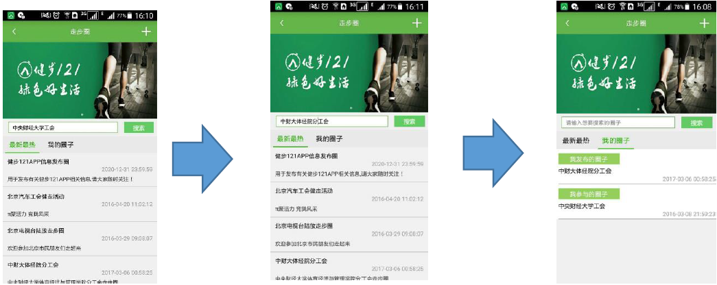 请参加活动的教职工用手机自行下载“健步121”APP,用京卡卡号或者身份证号注册,注册成功后登录进“健步121”主页,按照“会员服务”——“走步圈”——分别搜索“中央财经大学工会”和“中财大体经院分工会”——进入校工会和学院分工会页面后点击“签到”即可提交加入圈子的申请。实名提交加入圈子申请后,经管理员同意即可加入走步圈。