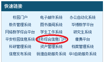 1.登陆学校主页,在快速链接处点击进入财务综合信息门户。