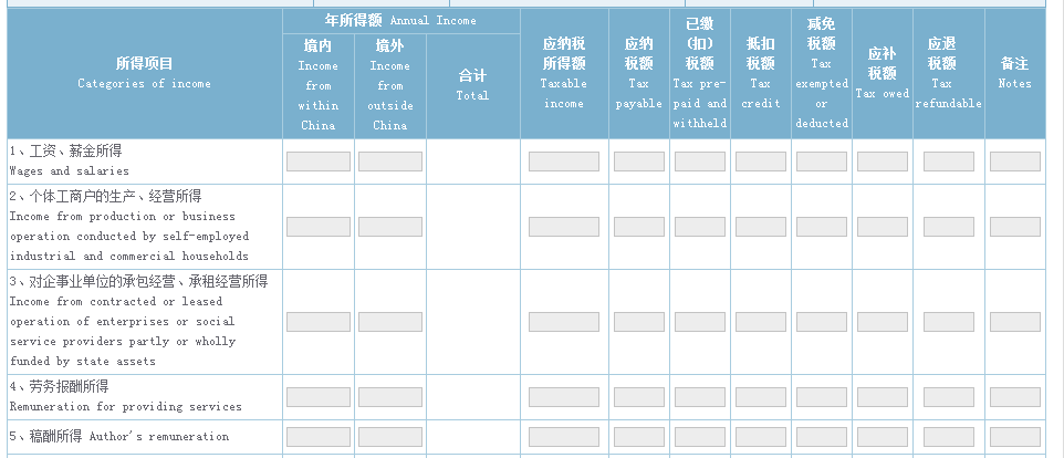 3.一般情况下,在我校取得的收入部分需要填写“工资、薪金所得”项目中“年所得额(境内)”、“应纳税所得额”、“应纳税额”、“已缴(扣)税额”等四项,其他项目为均为“0”。其中:(1)年所得额(境内)=工资项“应纳税所得额”+个人酬金“发放金额”;(2)应纳税所得额=年所得额(境内)-3500*本年度领取工资的月数(一般情况下为12个月)。外籍人员应纳税所得额=年所得额境内所得-4800*本年度领取工资的月数;(3)应纳税额=已缴(扣)税额=工资项“个人税”+个人酬金“扣税金额”