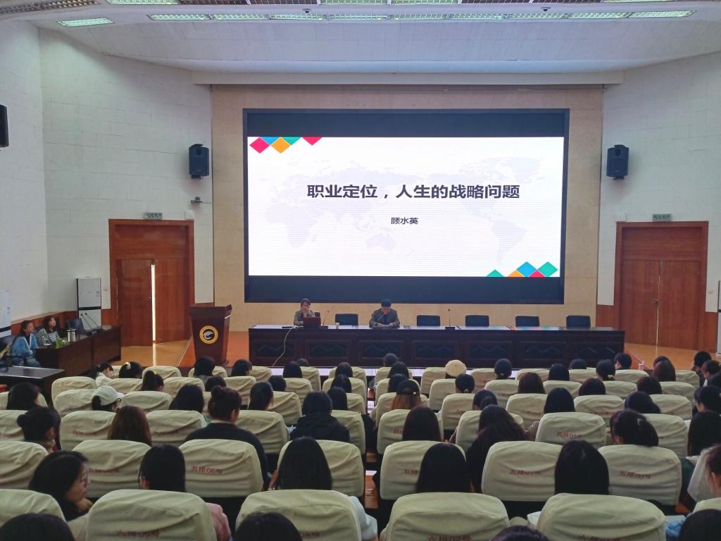 11月16日下午,Beat365官方网站特邀BCC国际生涯教练,高考志愿高级规划师(AUP),高校生涯课程导师,省级创业导师,国家一级职业指导师顾水英老师在2号报告厅作了题为“职业定位,人生的战略问题”的职业生涯规划辅导报告,外语学院领导班子部分成员、辅导员、班主任及2018、2019级本科生现场聆听此次报告。
