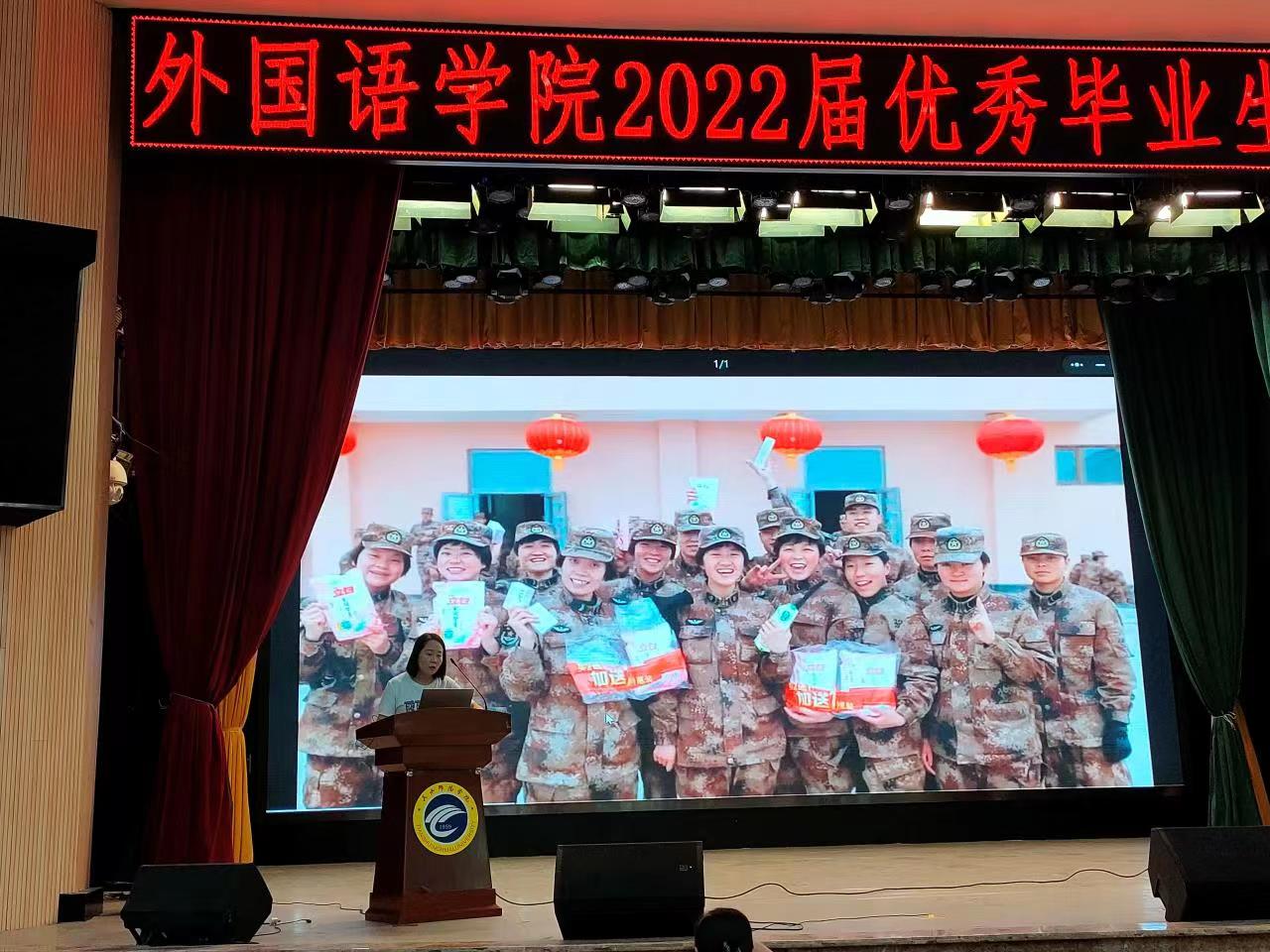 2018级优秀毕业生卢爱爱从军旅篇、访学篇和考研篇等三个方面入手,分享了自己的学习生活经历。首先,她围绕“军旅生涯”谈到自己参军的初心、入伍后的难忘时刻,以及参军带给自己巨大而深刻的变化。随后,她以在北京外国语大学南方研究院的访学生活为素材,分享了自己在学习方面的心得体会。她提到要不断尝试新事物,要有敢于突破自己的勇气,要善于抓住机会去拓宽自己的眼界;她以自己的学习经验告诉学弟学妹们,英语专业大学生在学习外国文化的过程更应该坚定文化自信,提升民族自豪感。接着,她分享了在疫情期间的考研经历,认为无论选择哪一条路都应该明确目标,坚定不移。同时也要找到适合自己的方法,只有把方法内化于心才能真正地提高自己。在学习的过程中也要学会不断反思自己,全面地认识自己。她寄语学弟学妹们,“世界上没有白走的路,每个人都有站在‘黑暗’里的时刻,但要满腔孤勇做自己的英雄!”