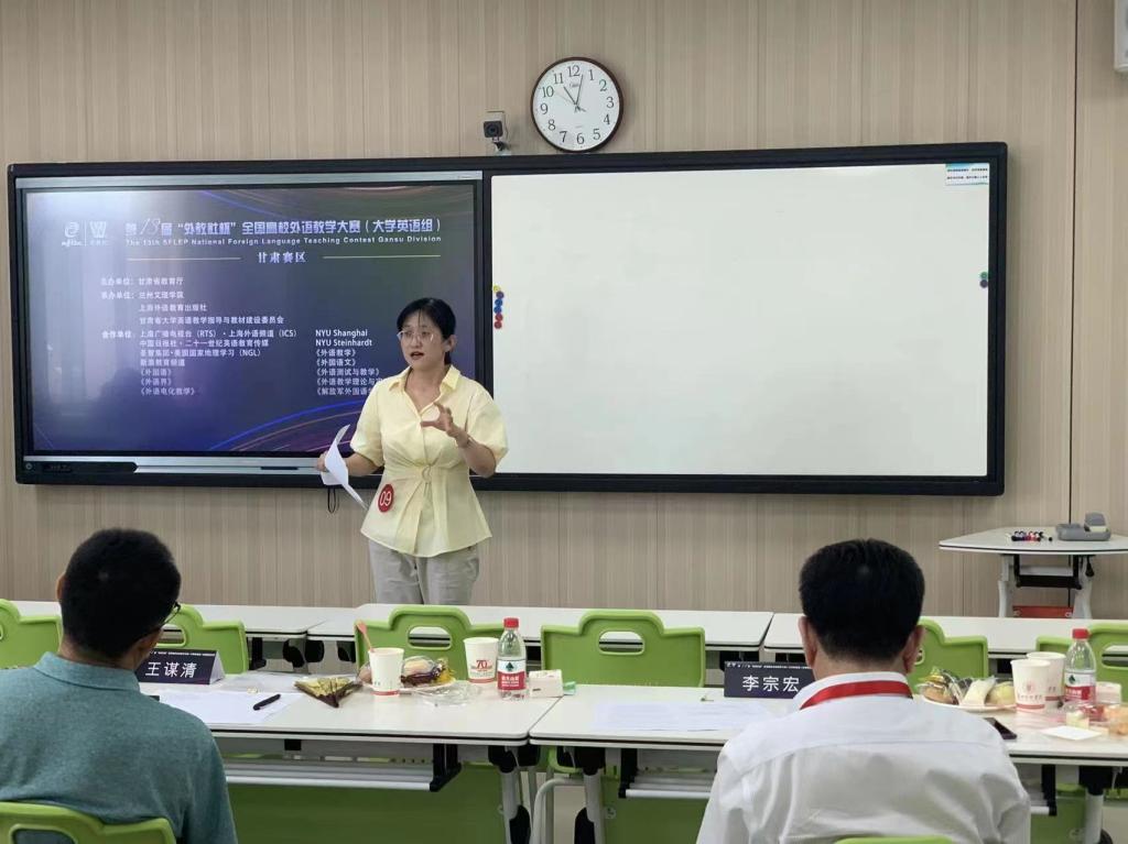 “外教社杯”全国高校外语教学大赛创建于2010年,是我国最早举办的全国性外语类教学赛事。大赛覆盖全国千余所高校,在中国高等教育学会发布的“全国普通高校教师教学竞赛分析报告(2012—2020年)”中,位列外语类教学大赛首位。第十三届“外教社杯”全国高校外语教学大赛甘肃赛区比赛由甘肃省教育厅主办,兰州文理学院、上海外语教育出版社、甘肃省大学英语教学指导与教材建设委员会承办,来自全省20所高校的40位英语教师分别参加了综合课组和视听说组的复赛和决赛。复赛内容为授课,参赛教师选择大学英语综合教程某一单元课文或视听说教程的视频材料进行教学设计,并在20分钟内展示教学方法、教学过程、教学效果及思政元素与大学英语教学的有效融合。在决赛中,参赛教师现场阅读800词左右长度的选文或观看长度约3-5分钟的视频,紧扣材料内容教进行说课,阐述教学设计并回答评委提问。Beat365官网两位教师在复赛和决赛中分别展现了良好的专业素养和扎实的理论基础。任晓妍老师采用国际前沿的教学方法CLIL(Content and Language Integrated Learning:内容与语言整合教学法)设计教学并授课,并在决赛中结合授课内容向评委专家介绍了CLIL的教学方法和原则,受到评委们的一致肯定,在复赛和决赛中分别名列该组第一名。