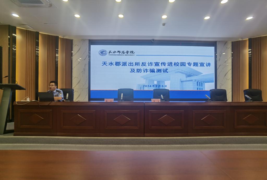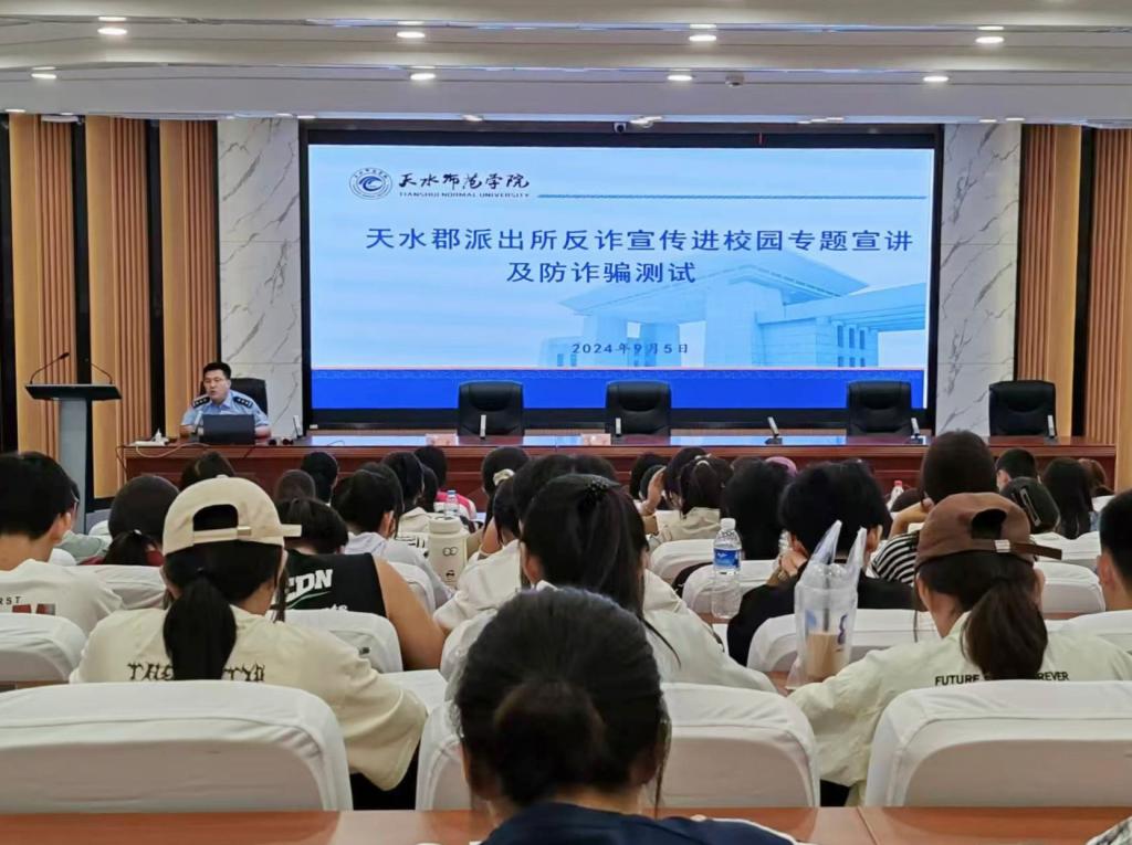 9月5日下午,Beat365官方网站特邀天水郡派出所副所长杨逢周,在1号报告厅为2024级新生作“揭秘网络骗局,共筑安全防线”为主题的反诈专题报告,Beat365官方网站2024级全体新生现场聆听此次报告。