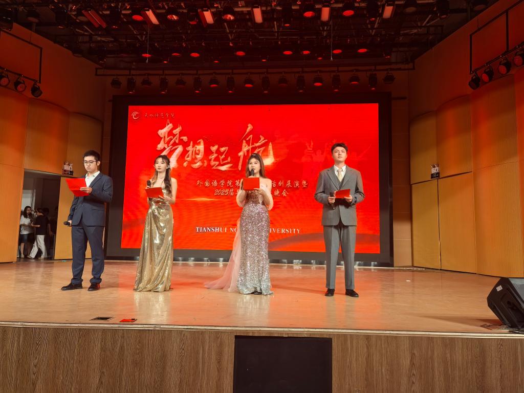 23级英语1班带来的英文话剧《逃出大英博物馆》以新颖的视角讲述中国文物渴望回家的故事,表达了作为中国青年对优秀传统文化的尊崇与认同。23级英语2班带来的英文话剧《文成公主入藏》生动再现了汉藏和亲的历史传奇,演员们流利的英文和精湛的表演赢得阵阵掌声。23级英语3班带来的《金陵十三钗》以细腻感人的表演,再现了战争年代中国女性的爱国情感与牺牲精神。23 级英语4班的《红楼梦》将中国古典文学巨著搬上舞台,精美的服饰和深情的对白让观众仿佛置身大观园。23级商务英语1班演绎的《甄嬛传之滴血验亲》以精彩的宫斗剧情和出色的演技,取得当晚话剧评分第一名的好成绩。23级商务英语2班带来的《张骞出使西域》则用磅礴叙事再现丝绸之路的开拓史诗,充分展现了外语学子“用外语讲好中国故事”的使命担当,获得现场观众的一致好评。