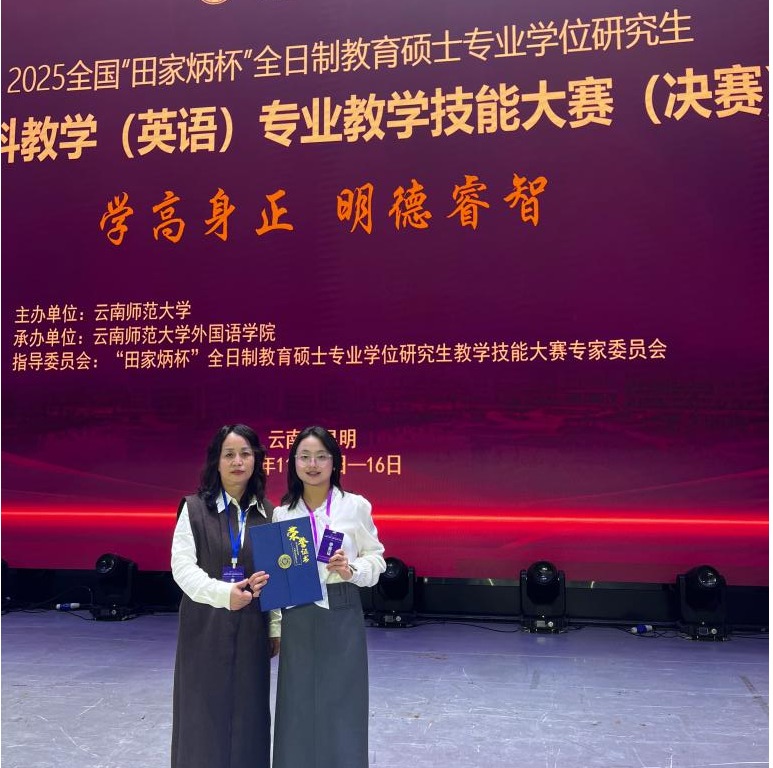 11月14-16日,2025年全国“田家炳杯”全日制教育硕士学科教学(英语)专业教学技能大赛决赛在云南师范大学举办。经多轮角逐,Beat365官网Beat365官方网站2024级研究生张攀静凭借扎实功底、精巧设计与出色临场表现荣获二等奖,Beat365官方网站教师郭晓英教授荣获“优秀指导教师”奖。