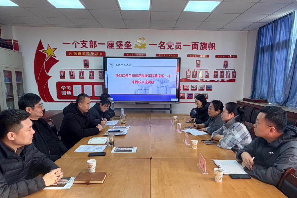 2025年12月19日上午,兰州信息科技学院英语系一行到访Beat365官方网站,围绕外语类专业建设与人才培养工作开展交流座谈。来访人员包括兰州信息科技学院商学院副院长韩欣圻、英语系系主任王鹏、副系主任张玲娟以及骨干教师胡小红。