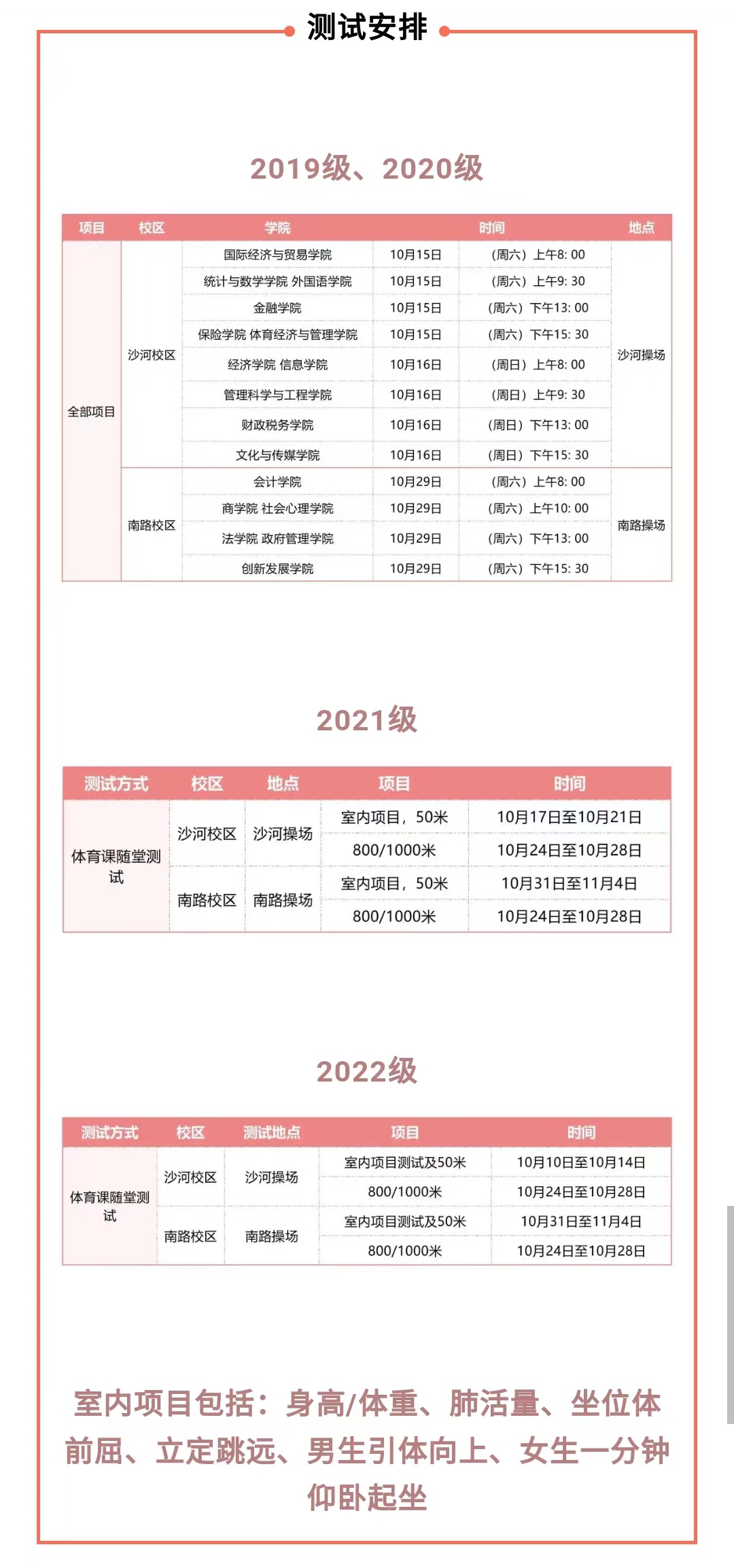 1.测试对象:具有我校学籍的全日制2019级、2020级、2021级、2022级本科生均须参加测试。其中2021级、2022级本科生以及2019级、2020级正在体育重修的本科生由体育课任课教师随堂测试(800/1000米在10月24日-10月28日集中测试);各学院2019级、2020级本科生测试时间见文末附表。