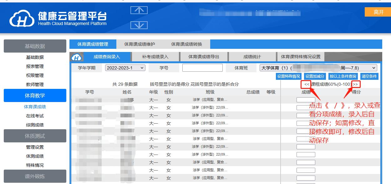 登录之后,把鼠标放到左上角,会出现下拉框,点击【体育课成绩管理】按钮,进入成绩录入界面。如下图: