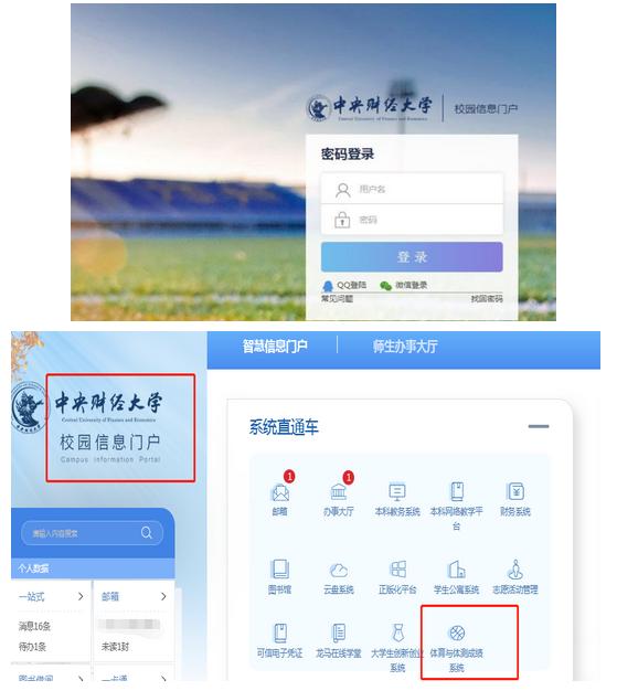 6.考试网址:http://10.13.7.220(务必使用IE、谷歌或火狐浏览器)或通过中央财经大学校园门户“体育与体测成绩系统”进入登陆页面,如下图: