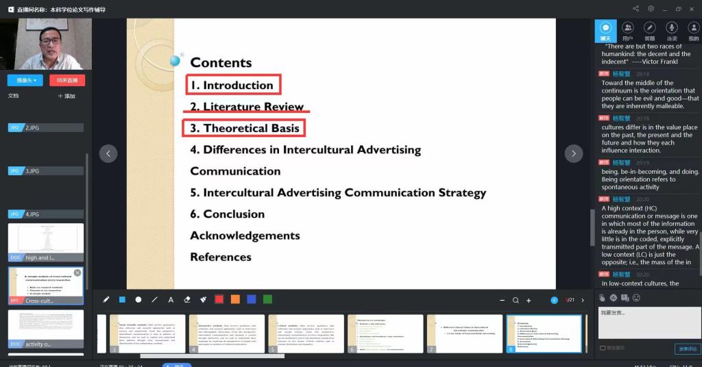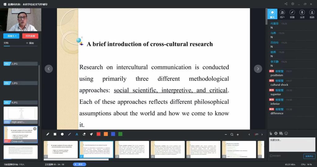 2021年11月22日,杨智慧老师通过超星学习通平台为英语专业本科生作了跨文化交际研究分析方面的专题讲座。杨老师介绍了跨文化交际领域中的三种主要研究方法和研究理论,并通过一个案例分析展示了跨文化交际类的论文写作。