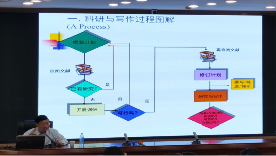 在报告伊始,李维屏教授提出了“机会成本”概念,提醒我们在职业生涯中要懂得“取舍”。在报告中,李教授主要分享了对做学问的四点基本看法。他认为,学术精神是研究者做学问的支撑力量;做学问最大的敌人是研究者自己的惰性;学术研究的进展取决于研究者的知识和能力;研究者要追求学问,要具有创新意识,要做有价值的学问。李教授用一张流程图向同学们形象生动地展现了科研与写作的过程,重点介绍了学术研究的方法。他强调,首先,要认真选题,课题应具有原创性、前沿性、可操作性及可持续性;其次,论文题目要精心设计,凸显学术性和理论性;第三,论文布局要合理,编排有序,章节合理,篇幅均衡以及语体统一;还要注重课题的论证问题,科学论证,要主题突出、观点鲜明、论据充分、思路清晰且表达精当;最后,还要注意论文体例的规范,例如,关键词是否全面确切、引文是否恰当合理、参考书目是否权威最新等。在讲座最后,李维屏深切寄语,希望我们可以明确专业方向,保持学术面貌,要体现独立的学者风格和批评意识,要拓展研究领域。