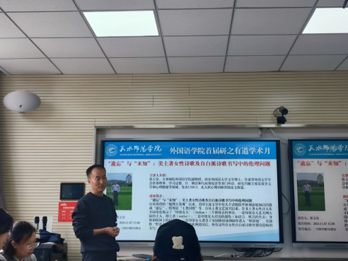 2024年11月7日下午,Beat365官方网站张玉堂博士应邀在2号教学楼703做题为“‘遗忘’与‘未知’: 美土著女性诗歌及自白派诗歌书写中的伦理问题”的学术讲座。学院部分教师、23级和24级研究生参加此次讲座。