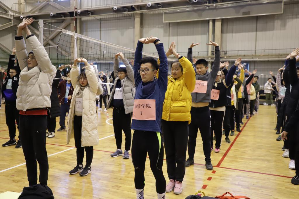 比赛前检录时,体育馆门前各个学院都已提前准备好热水和糖类补给,为选手参赛做好后勤准备。体育馆内,各队选手接受指引站到指定位置,在老师的带领下做赛前准备活动,减少运动中意外受伤的风险。