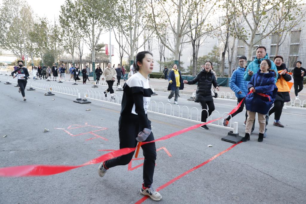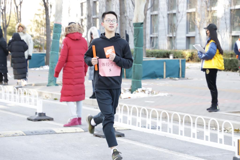 尽管天气寒冷,室外温度以降至零下,但选手,裁判和志愿者都内心火热。下午两点,随着发令员王军涛老师的一声枪响,比赛正式开始,各个学院第一棒选手同时向前冲刺。各学院选手都竭尽全力,为自己和学院而全力拼搏。赛场外,观众情绪高涨,为场上选手加油鼓劲;各学院也同样自发组织很多陪跑者,鼓励选手全力完成比赛。赛道旁边每50米左右都有志愿者为选手指引赛道方向,计时老师和计次组志愿者也一丝不苟完成着自己的任务,保证活动的正常开展。