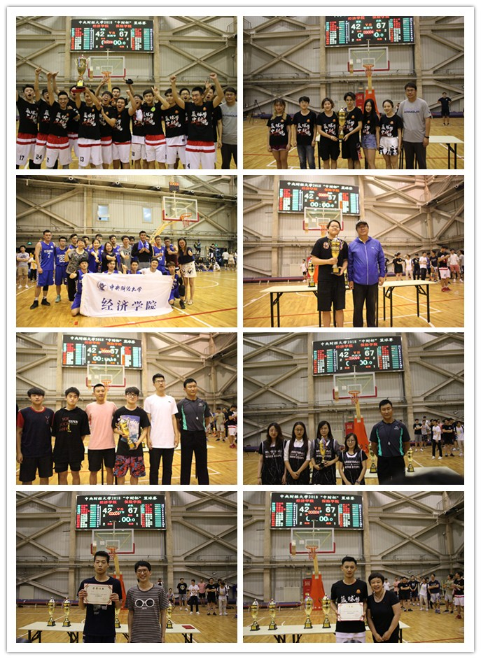 最终的比赛获奖结果为:保险学院男篮、管理科学与工程学院女篮夺得冠军,经济学院男篮、商学院女篮获得亚军,商学院男篮、法学院女篮获得季军。商学院的李睿琛同学获得三分球比赛冠军,保险学院的麻乂邦同学获得“最有价值球员”称号。