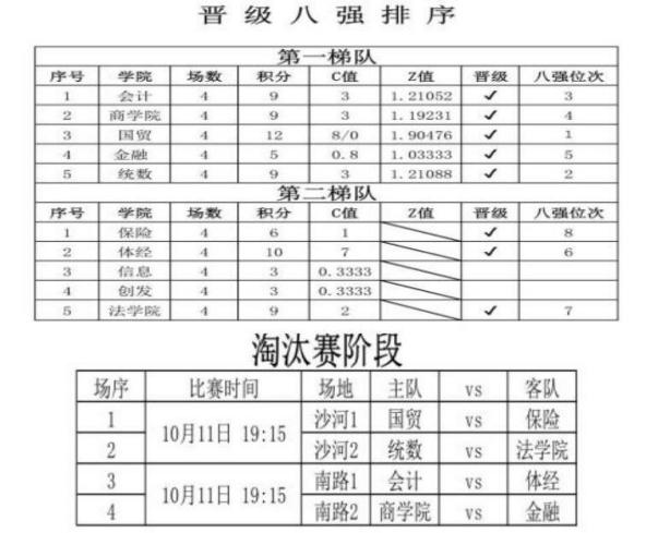 第二阶段赛事结束后,会计学院、商学院、国际经济与贸易学院、金融学院、统计与数学学院进入第一梯队,保险学院、新葡萄官网amg、信息学院、创新与发展学院、法学院进入第二梯队。