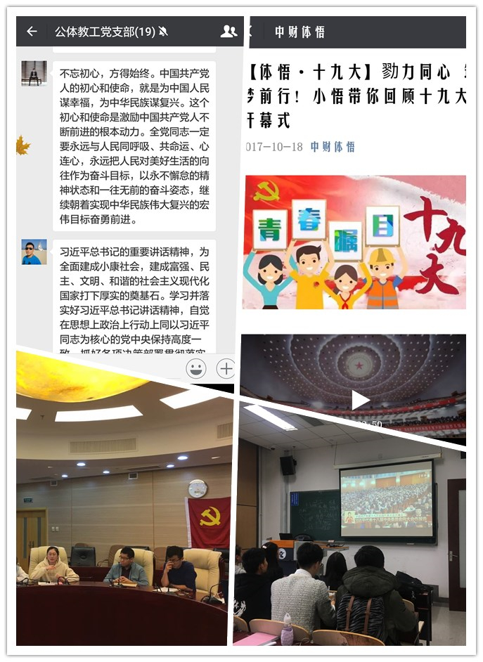 由沙河校区学生担任编辑的学院学生工作公众号“中财·体悟”联合第二学生党支部的其他党员同学,向全院学生推送了一篇《勠力同心 筑梦前行!小悟带你回顾党的十九大开幕会》的文章,文章的主题是“青春瞩目党的十九大”体现了同学们密切关注党的十九大的盛况。