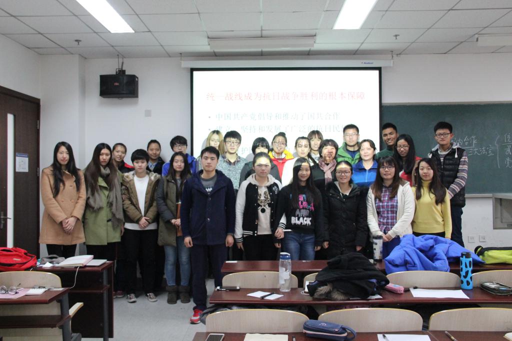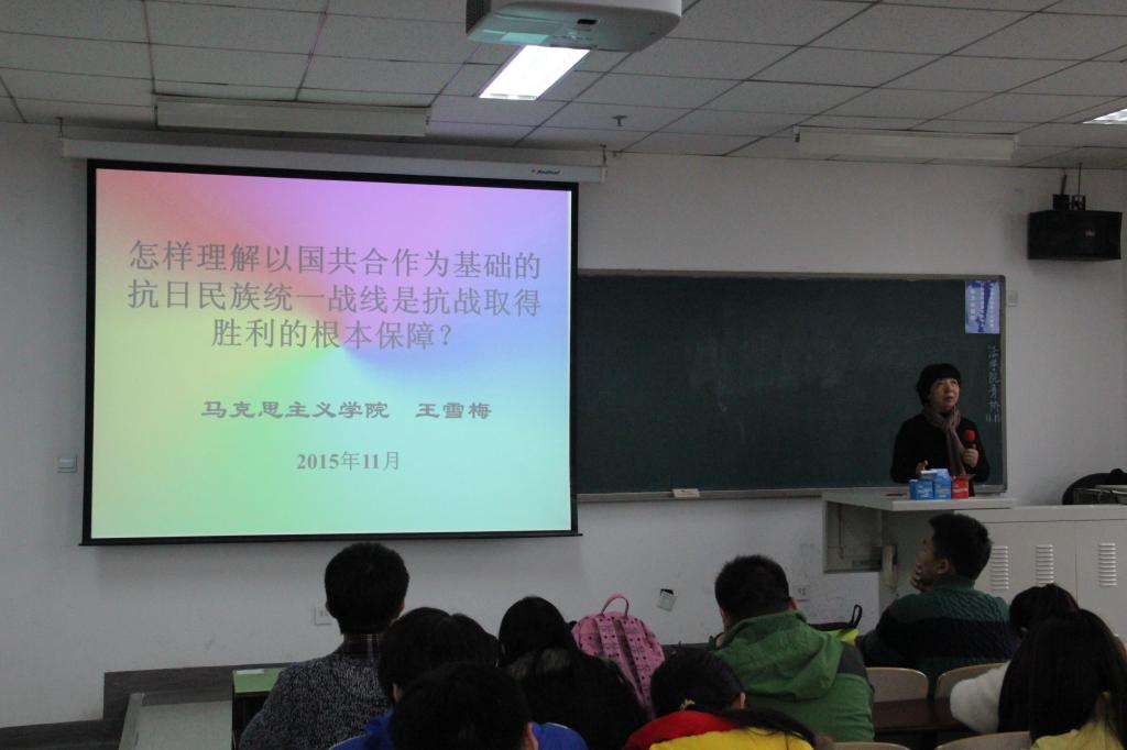 第一堂专题课堂教学由王老师以“怎样理解以国共合作为基础的抗日民族统一战线是抗战取得胜利的根本保障”为主题进行授课。王老师通过对这段历史的梳理,详细讲述了抗日民族统一战线的建立背景、实施过程和政策转变,帮助同学们更加深刻地认识到抗日战争是在中国共产党倡导建立的抗日民族统一战线旗帜下,以国共两党合作为基础,全国各民族、各阶级、各党派和各界人士及海外侨胞广泛参加并取得伟大胜利的一次全民抗战。抗日战争的胜利是中华民族强大凝聚力的伟大胜利,是中华儿女爱国主义精神的伟大胜利,是包括中国人民在内的爱好和平的世界各国人民联合一致抗击法西斯的伟大胜利。抗日战争胜利的经验证明,抗日民族统一战线是中华民族、中国人民和中国共产党取得抗战胜利的重要法宝。在最后的交流环节同学们结合课堂内容以及时事热点积极踊跃地提问,王老师用“历史没有如果”回答了同学们关于那段历史的提问,更讲解了当前海峡两岸的合作交流现状。此次专题学习帮助同学们正确客观看待抗战时期的国共合作,牢记历史,展望未来。