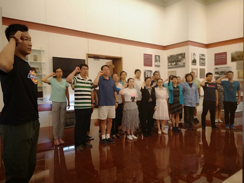 在电影厅内,纪念堂管理局宣教处副处长对毛主席纪念堂做了整体介绍,同志们聆听了《学领袖风范,做合格党员》宣讲并观看了《千秋伟业》纪录片。随后,全体党员在公体课教工党支部书记杨海林同志的带领下,举起右手,庄严宣誓,重温了入党誓词。最后,大家参观了毛泽东纪念室,通过生动珍贵的历史画面、解说员的讲解以及大量翔实的照片、文献和实物,重新回顾毛主席光辉的一生。全体党员深刻感受到了革命领袖们领导中国革命和建设的艰辛历程,感受到了从浴火中诞生的中国共产党的伟大与光辉。