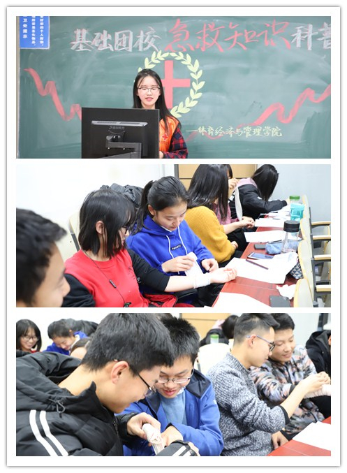 开课前,组织部给每个同学印发了红十字会相关课程的导学案。这次活动分为两大主题——止血包扎和常见意外情况处理。活动伊始,来自红十字会急救部的两名部员讲师向团员们介绍了外伤急救和伤口处理的相关知识,以幽默风趣的方式进行讲解,牢牢抓住了同学们的注意力。然后,团支书按人数均分原则将同学们分为三组,紧接着,同学们井然有序地进行伤口包扎的实践操作,个个非常认真,讲师也耐心地在旁边指导。最后,讲师们还向同学们介绍了常见意外情况处理的相关知识,例如:烧烫伤、扭伤、中暑、食物中毒等预防和处理措施。时间一分一秒地过去了,活动也接近了尾声,团员们仍兴致盎然,不舍离去。