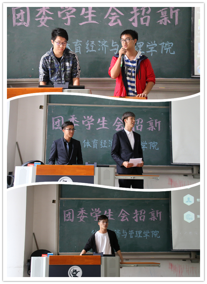 接下来,进行团委、学生会招新宣讲。九个部门依次上台进行宣讲,介绍每个部门,欢迎各位新生。各部门负责人将本部门介绍的详细生动、各有特色——办公室的详细清晰、文艺外联部的正式庄严、青年志愿者协会的贴近生活、生活部的深入人心、体育部的有力感召、宣传部的别具一格、学术实践部的引人注目、组织部的有条有理、项目部的风趣幽默。各位负责人针对本部门的特点,全面的向新生们展示了部门职能,使新生对各部门有了充分的了解,有利于他们做出合适的选择。