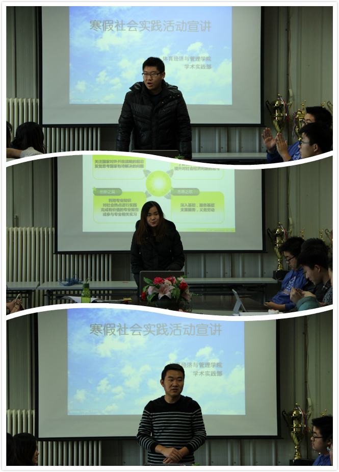 1月6日下午,新葡萄官网学术实践部在沙河校区体育馆二楼召开了“寒假社会实践活动”宣讲会。新葡萄官网团总支书记张振磊老师、部分14级同学以及全体15级同学参加了此次会议。此次会议旨在向大家介绍我校寒假社会实践活动的流程以及如何更好地进行实践,便于大家更好的开展实践活动。