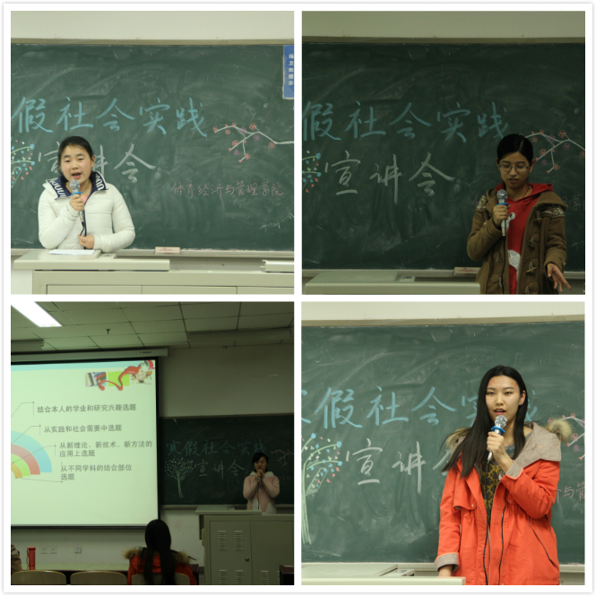 12月25日晚,为了让14级同学顺利开展寒假社会实践活动,新葡萄官网amg在沙河校区东区主教209开展了“寒假社会实践宣讲会”活动,此次宣讲由学术实践部部长张怡主持,全体14级学生均参与其中,宣讲人有学术部部长副部长尹子頔以及来自13-1班的熊瑶、钟明航。