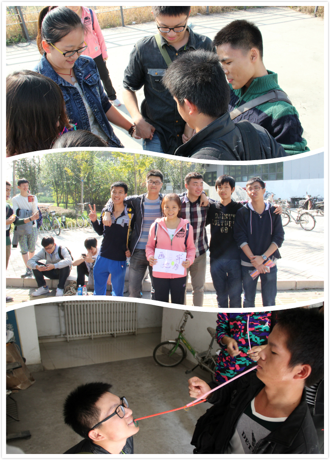 18日一早,同学们怀着好奇与兴奋齐聚教室,并在主持人的安排下,以8人小组形式正式出发。每个小组都同时有大一大二两个年级的同学,他们拿着特定的指示牌,根据所给线索寻找各个活动的地点。在这个过程中,对校园熟悉的大二学生们尽心尽力,在找到活动地点的同时为新生们介绍校园,使整体气氛十分融洽。六个活动地点分别进行着“跳大绳”、“画地为牢”、“跳跳跳”、“七手八脚”、“新华容道”和“环环相传”的活动。“跳大绳”“七手八脚”“画地为牢”非常考验组员们的配合程度和默契程度,“跳跳跳”是对体力极大的考验,“新华容道”“环环相传”两项活动非常有趣,同学们在游戏过程中欢笑不断。在活动的过程中,同组同学们团结协作、“马力全开”,每一个人都参与其中。倾听与思考并重,分析与交流并存,在活动过程中很好的拉近了相互之间的距离。最后,完成任务的队伍在终点相互交流并合影留恋。在热烈的气氛中,本次破冰活动圆满结束。
