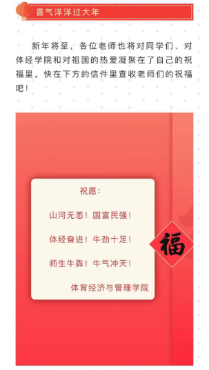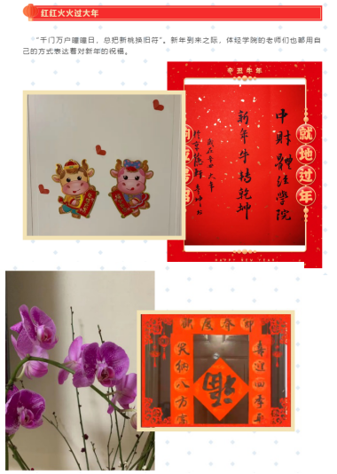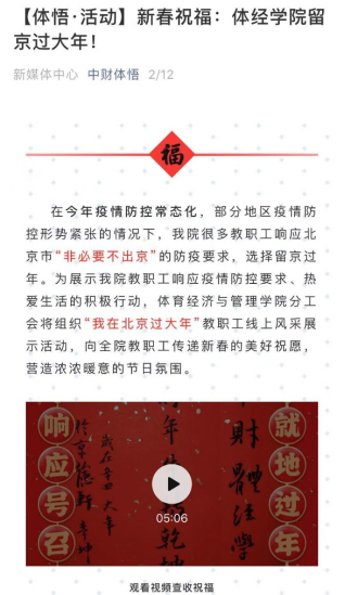 线上祝福活动在学院党总支书记林琼教授和院长张本家教授的带动下,留京过年的教职工积极参与,本次活动共收到20多位留京过年的老师们的短视频投稿。活动通过“红红火火多大年”、“健健康康过大年”、“喜气洋洋过大年”等专题,老师们用自己制作的短视频展示了体经人过年的各项准备、北京的年味及新春祝福。